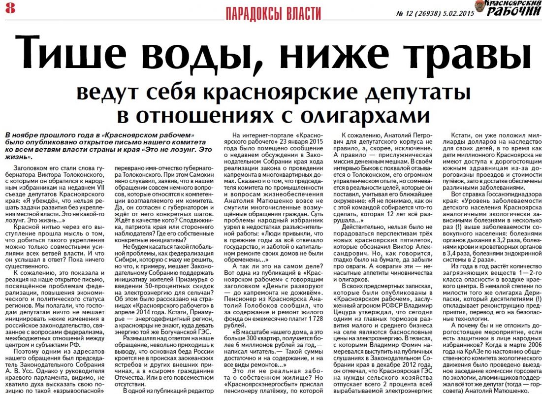 Как известно, народная мудрость гласит: "Повторенье - мать ученья". Потому и члены нашего комитета посчитали нужным вернуться к собственной статье "Тише воды, ниже травы", сопровождавшейся подзаголовком "Ведут себя красноярские депутаты в отношениях с олигархами". Она была опубликована на страницах "Красноярского рабочего" в феврале 2015 года. Напомним, статья эта появилась после нашего открытого обращения по проблемам федерализации, повышения экономического и политического статуса региона. Мы полагали, что господам депутатам, именующим себя слугами народа, ничто не мешает инициировать некие изменения в российском законодательстве, связанные с вопросами федерализма, межбюджетных отношений между центром и субъектами РФ. Одним из адресатов обращения был тогдашний председатель Законодательного Собрания А. В. Усс. Но, к сожалению, никакого ответа от него не поступило. Хотя незадолго до этого послания сам Александр Викторович в газетном интервью с тревогой отмечал резкое ухудшение рейтинга края, увеличивающийся государственный долг при устойчивом росте внутреннего регионального продукта. И вызвано это было тем, что платежи в федеральный бюджет, по сравнению с 2010 годом, выросли в 2,6 раза... В своей предсмертной статье-завещании "Лучше меньше, да лучше" В. И. Ленин не случайно размышлял, сумеем ли мы цивилизоваться "для того, чтобы перейти непосредственно к социализму". Как оказалось, не сумели. Ведь что обозначает термин "цивилизация"? В "Толковом словаре" В. И. Даля сказано: "Сознание прав и обязанностей человека и гражданина". В "Словаре иностранных слов" даётся такое определение: "Уровень общественного развития, определяемого развитием производительных сил". Как пример цивилизованного подхода можно привести Канаду, во многом схожую с Россией по размеру и климату, но только не по уровню жизни населения. Наша северная соседка - страна развитого федерализма. Тамошние провинции - полноправные хозяева своих природных ресурсов. Подобно штатам в США, они наделили центр полномочиями, а не наоборот, как это происходило при принятии действующей российской Конституции. Наш центр остался без присмотра регионов. И произошло это не по указке Госдепа, а по воле московской бюрократической камарильи, приступившей к прихватизации общенародной собственности. В итоге имеем дикий капитализм с безмерным обогащением кучки приближённых к трону батюшки-президента и нищающим населением. Откуда берётся бедность при теперешнем уровне развития производительных сил? Только от неумения (или нежелания) ими воспользоваться. Упустил возможности научно-технической революции, вовремя не произвёл структурную перестройку экономики, не навёл порядок в своём доме - мигом оказался в аутсайдерах. В тех же США по уровню доходов населения наиболее бедными оказались штаты, чьи недра наиболее богаты полезными ископаемыми. Во многих округах Техаса и Оклахомы душевой доход в 1,5-2 раза ниже средненационального. Причина? Расплата за беспечность, с которой правящая элита купалась в нефтяном изобилии. И не то ли мы видим в Красноярском крае, из которого потоком уплывают уголь и золото, нефть и алюминий, лес и никель? Если в 2013 году в нашем крае за чертой бедности находились 478 606 человек, то в 2015-м - уже 547 338. Росло число бедняков и далее. Но вот вопрос: если нищает народ, то с како